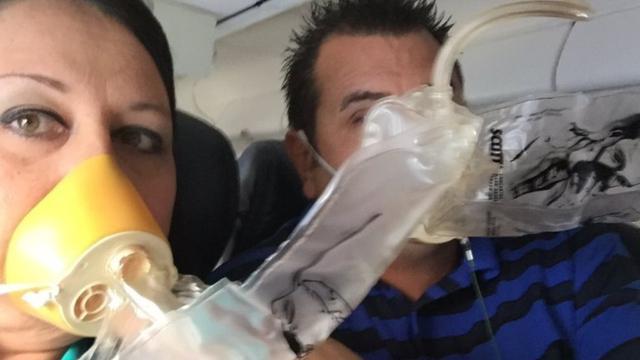 Penumpang mengenakkan masker pernapasan saat pesawat mulai turun (Twitter/CNN)